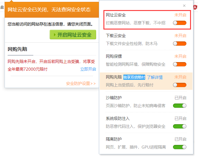 或者在网址栏点击“危险状态”->安全防护设置->关闭网址云安全即可